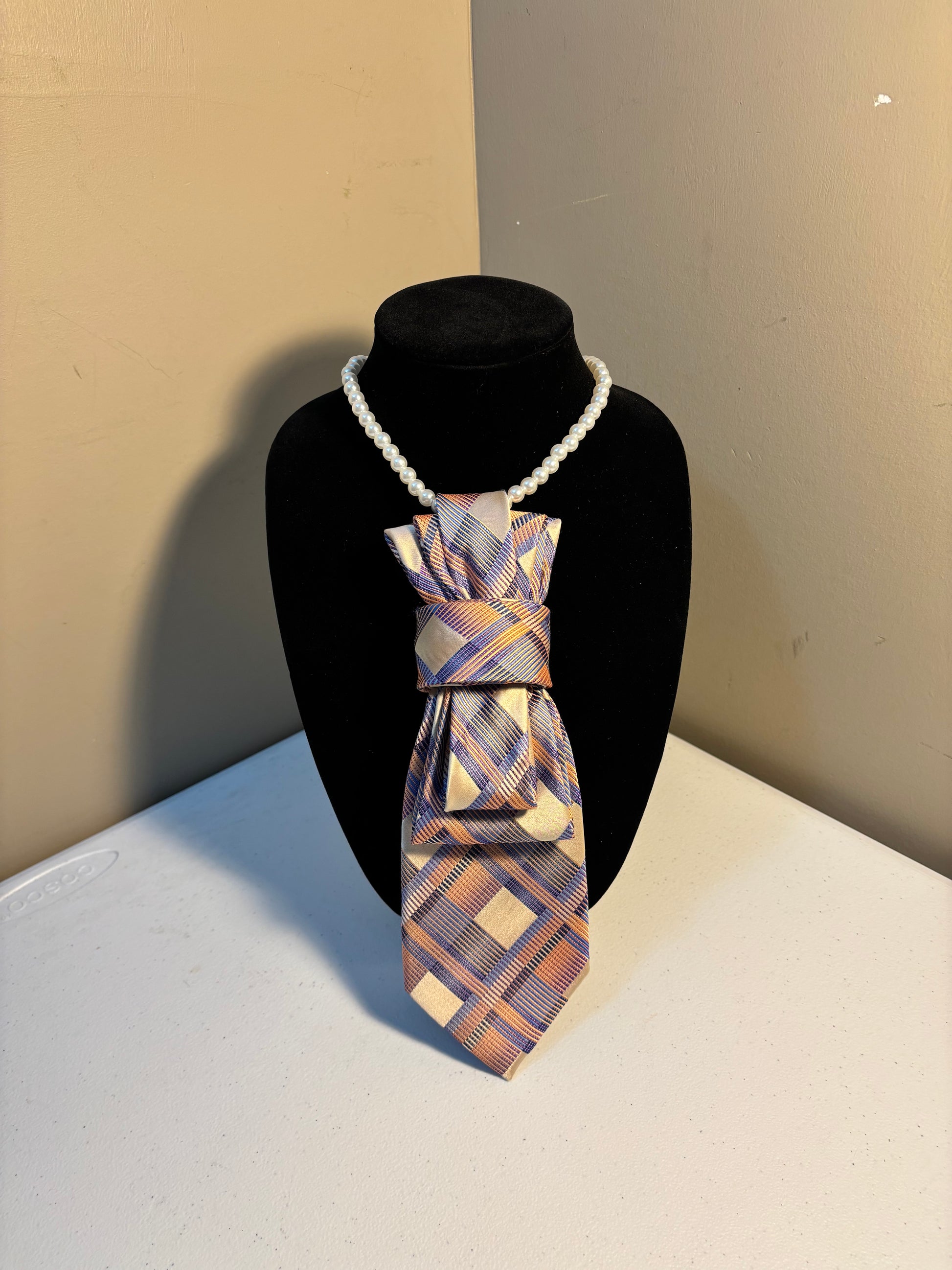Imagine a luxurious tie necklace crafted from a smooth satin fabric that feels soft against the skin. The tie is designed with a tapered silhouette, seamlessly blending elegance and boldness.