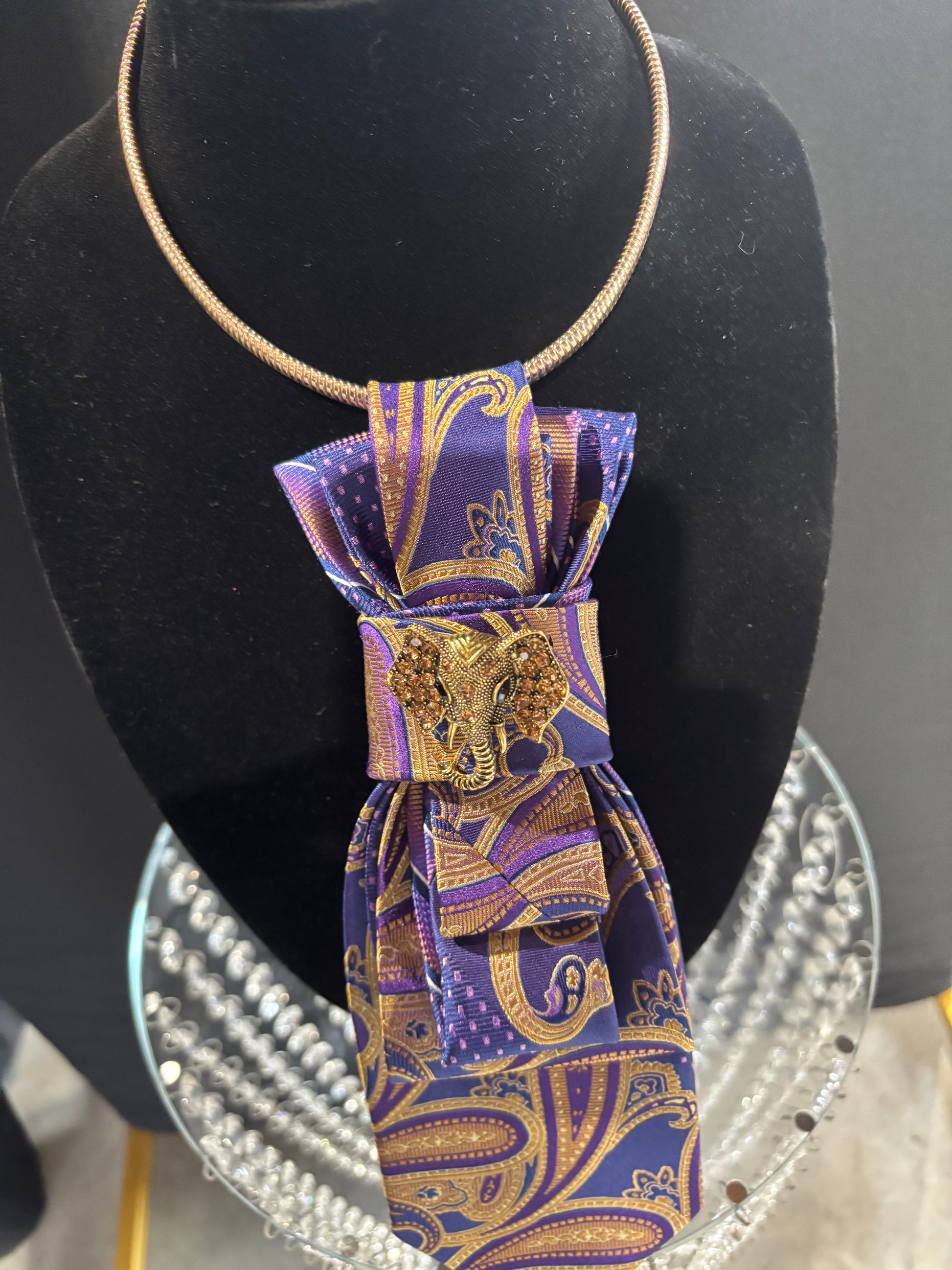 Imagine a luxurious tie necklace crafted from a smooth satin fabric that feels soft against the skin. The tie is designed with a tapered silhouette, seamlessly blending elegance and boldness.