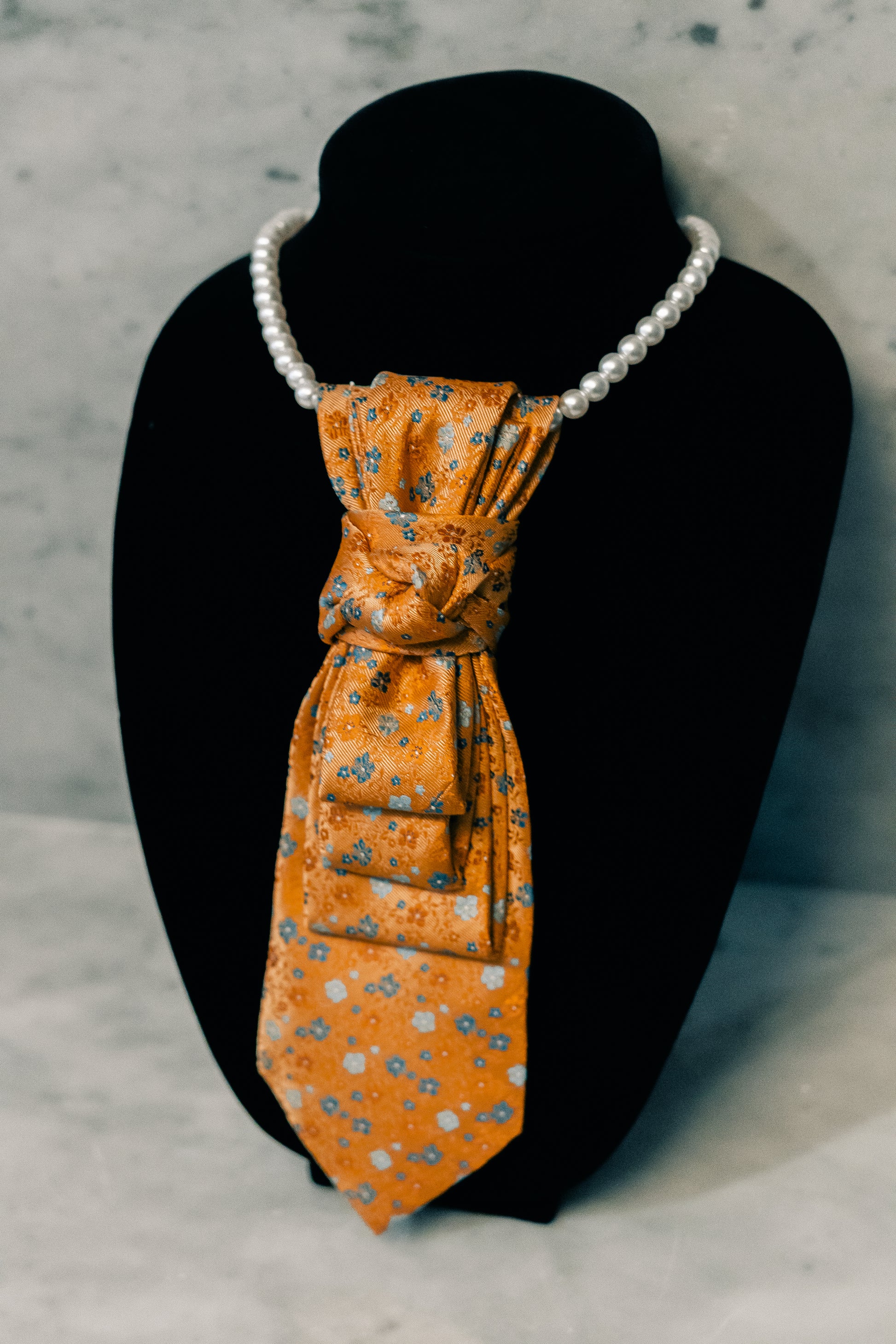 Imagine a luxurious tie necklace crafted from a smooth satin fabric that feels soft against the skin. The tie is designed with a tapered silhouette, seamlessly blending elegance and boldness.